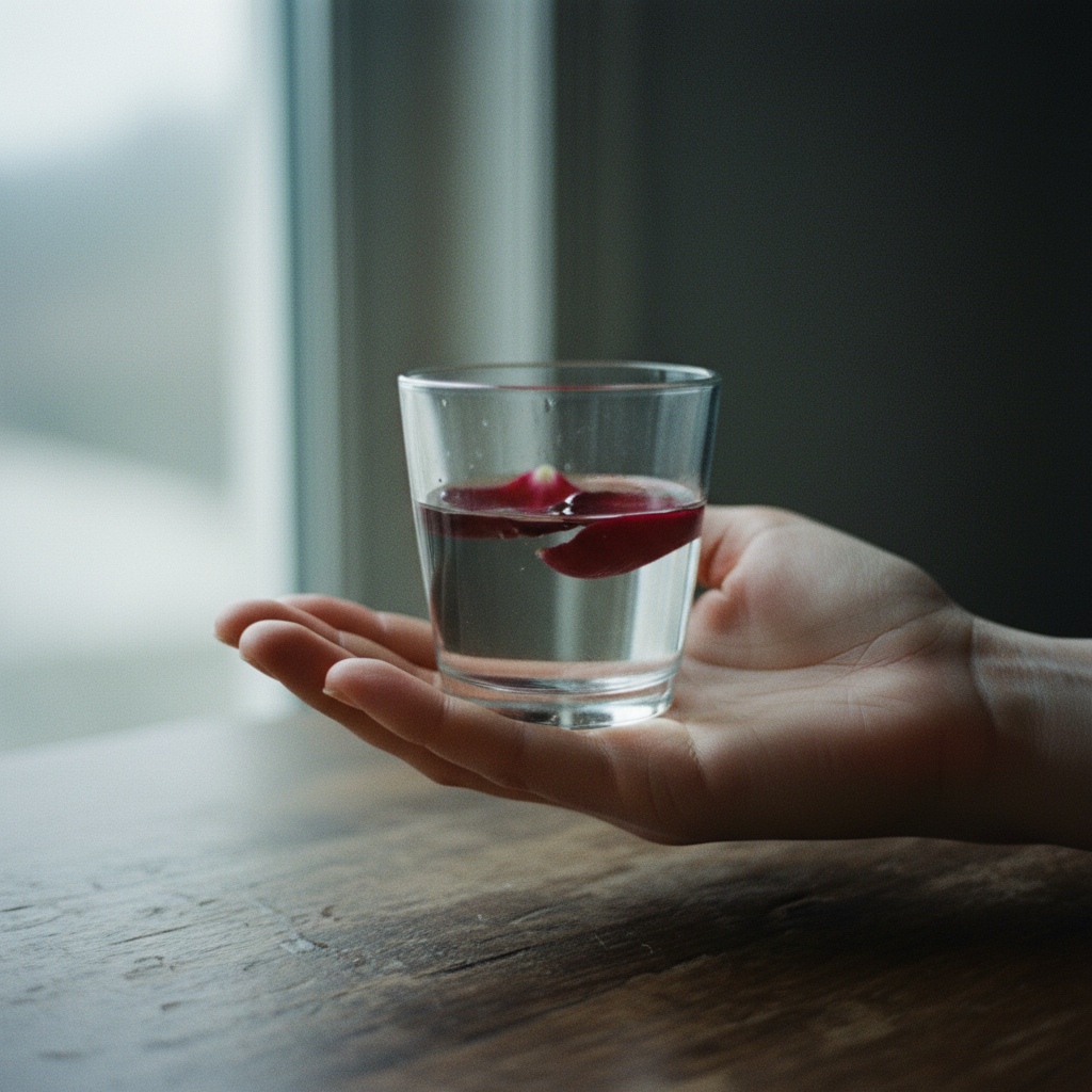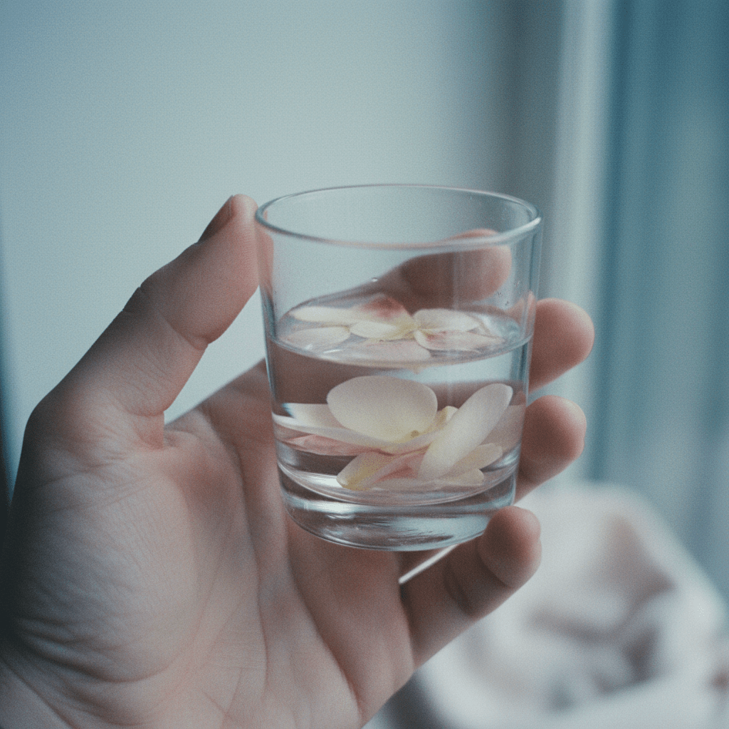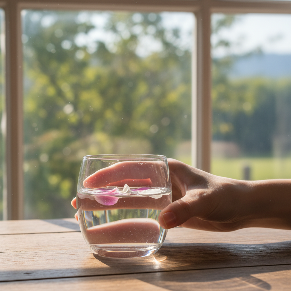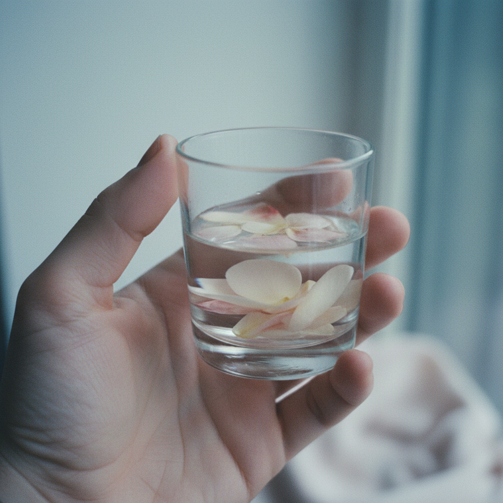 A hand holds a small glass of water. A few flower petals float on the surface. The glass sits on a wooden table near a window. Morning light. No text.