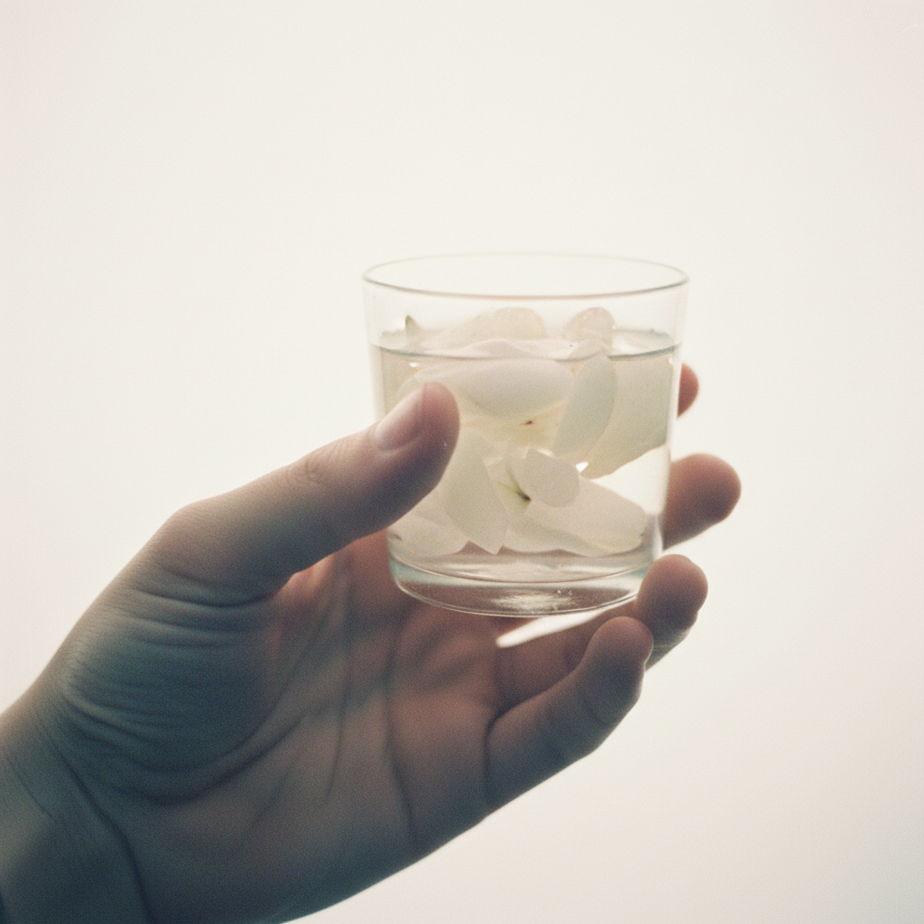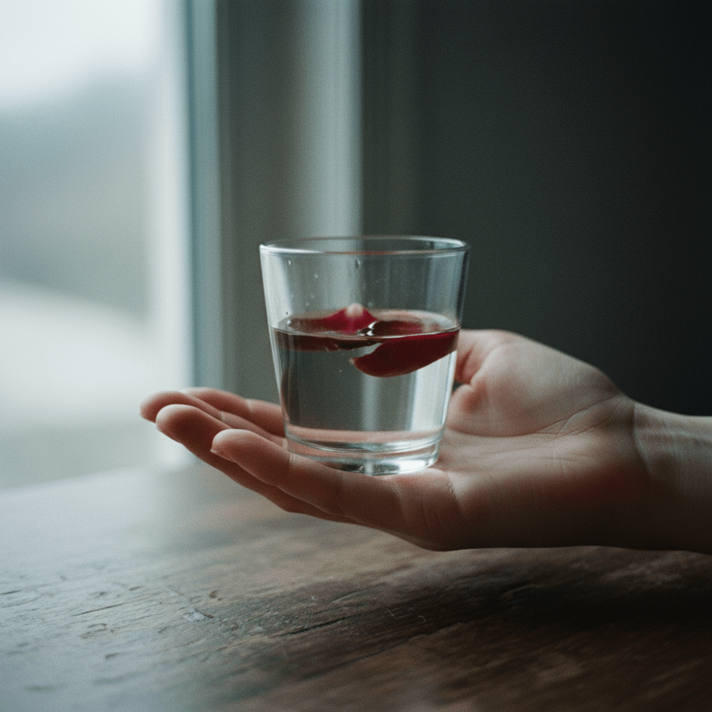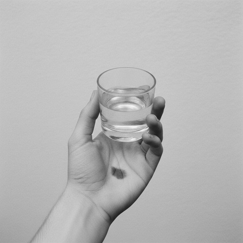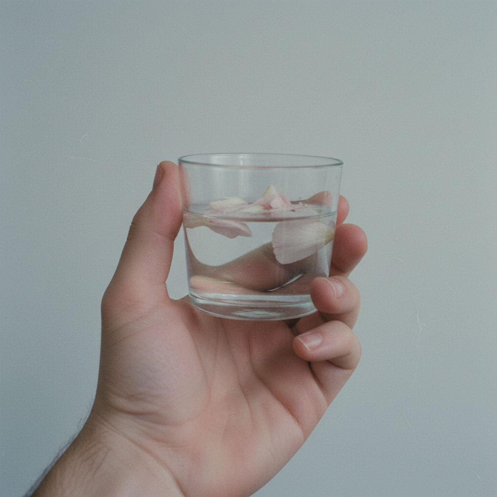 A private photograph, taken alone. A hand holds a small glass of water. A dark petal has left a faint stain on the palm. The water is slightly cloudy. Plain white or pale grey ground, no background. Hand and glass only. No table. The image feels like something the photographer kept for themselves, not to share. Cool, flat light. Visible grain. Not lifestyle. Not stock. Not decorative. No text.