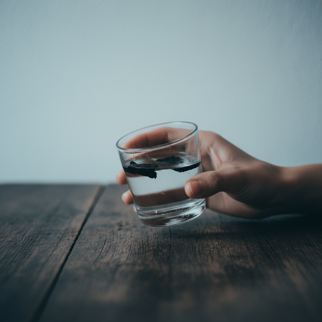 Photograph. A hand lifting a small glass of water from a wooden table. Two dark petals floating inside. The glass is slightly tilted, water near the rim. Plain pale background. Tight frame — glass, hand, and table edge only. Cool diffuse light from above-left, no window visible. Film grain, slightly underexposed. Muted tones. No text.